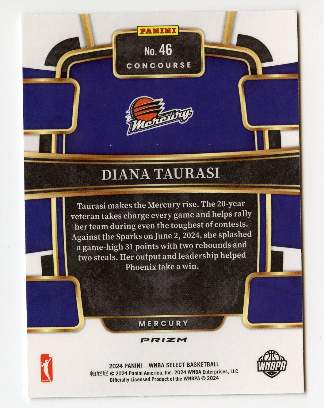 A309 DIANA TAURASI 2024 SELECT SILVER PRIZM REFRACTOR CONCOURSE #46 MERCURY