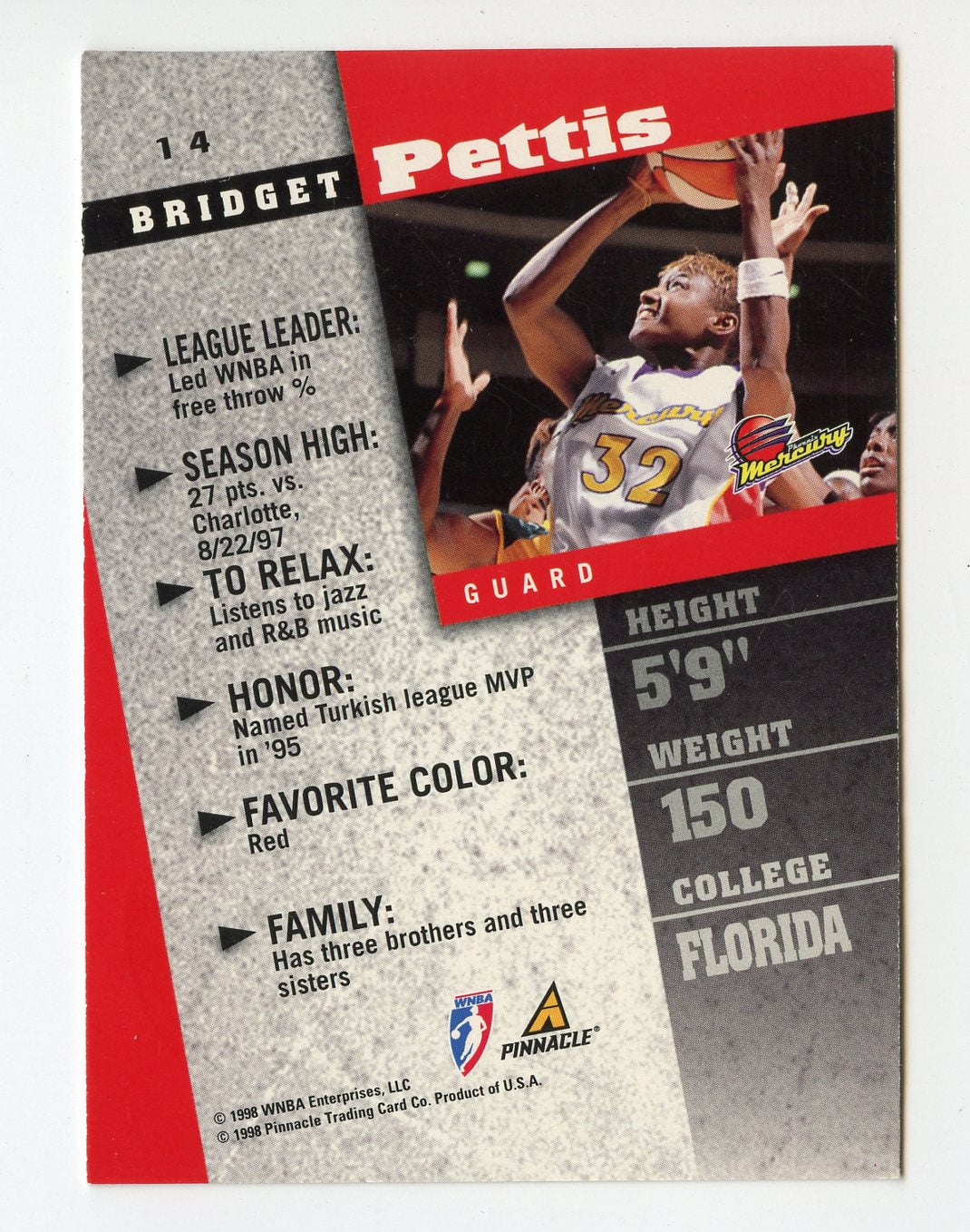 WNBA18 BRIDGET PETTIS 1998 PINNACLE COURT COLLECTION #14 MERCURY