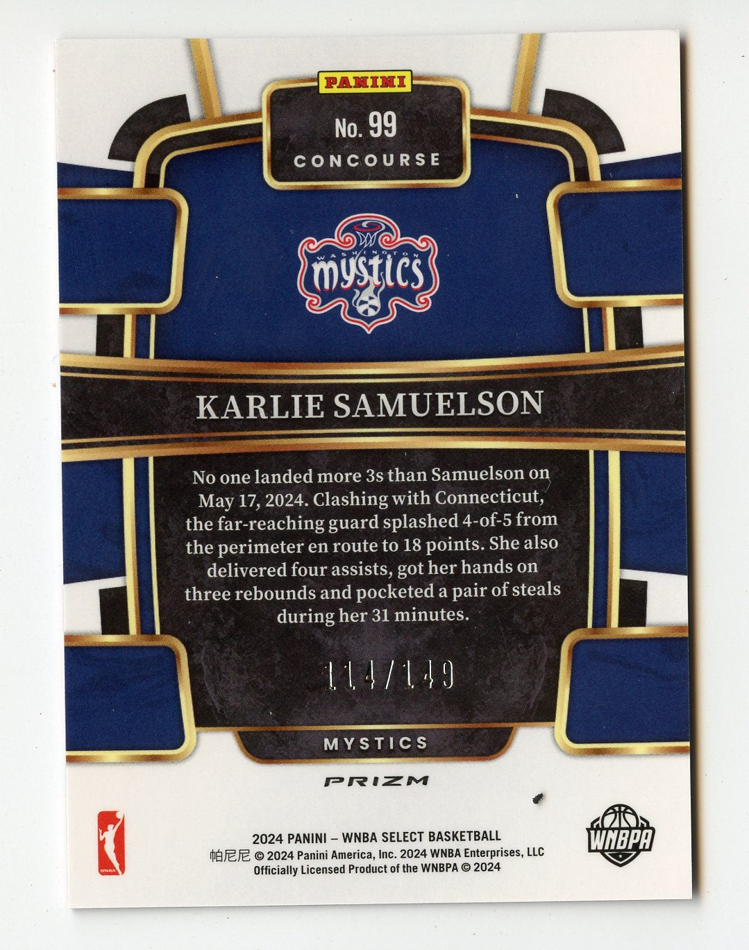 WNBA25 KARLIE SAMUELSON 2024 SELECT RED REFRACTOR 114/149 #99 MYSTICS