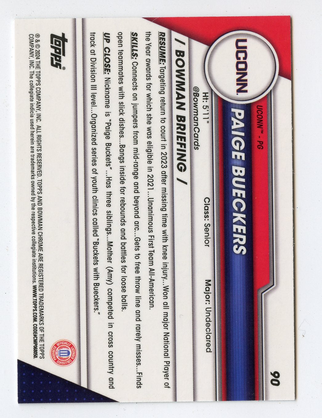 WNBA6 PAIGE BUECKERS 2024 BOWMAN CHROME UNIVERSITY 1ST #90 UCONN